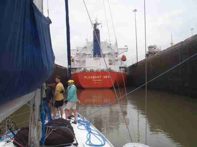 After yesterday’s morning delay, we were re-scheduled to pick up our canal advisor at 3:30pm, and transit straight through, without spending the night on Gatun lake. And it actually worked that way. We have a 32-foot Brazilian sailboat rafter up to us on entering the first Gatun locks, and we transited in the center of the chamber, directly behind a monster tanker. There is indeed some turbulence when the lock fills, and when the tanked engages his propellor, but we handled things fine and locked up the 3 locks without incident.